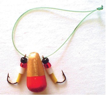 Уральская балда это оригинальная блесна, состоящая из грузила и двух крючков скользящих по небольшому отрезку лески. Уральскую балду можно сделать самому, а так же приобрести в магазине серийно выпускаемые приманки. Крючки на приманке небольшого размера, поэтому на них ловятся окуни любого размера. Балда на столько привлекательна для окуня, что они бросаются на нее, даже если они сыты. Для привлечения большего внимания можно надеть на крючки бисер или цветные трубочки эмитирую любимые деликатесы окуня, например мотыля и мормыша. Для ловли на балду подойдет любое удилище с кивком. Особых требований к кивку нету, лишь бы он передавал поклевки и касание грузилом дна.